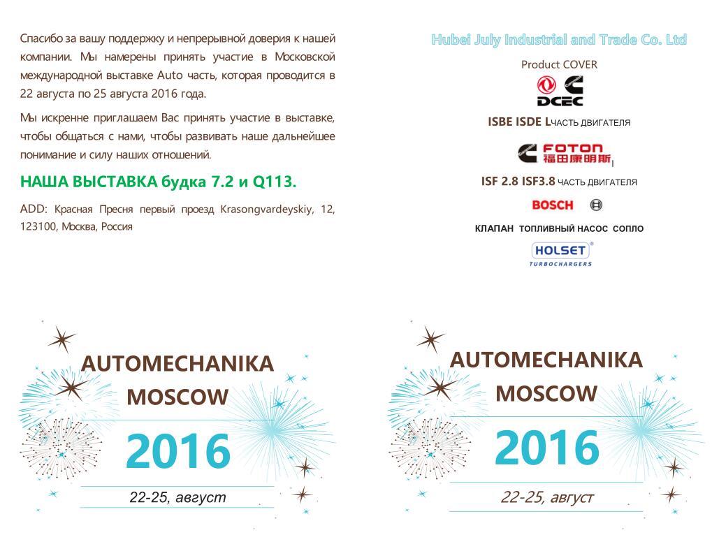 Спасибо за вашу поддержку и непрерывной доверия к нашей компании. Мы намерены принять участие в Московской международной выставке Auto часть, которая проводится в 22 августа по 25 августа 2016 года.